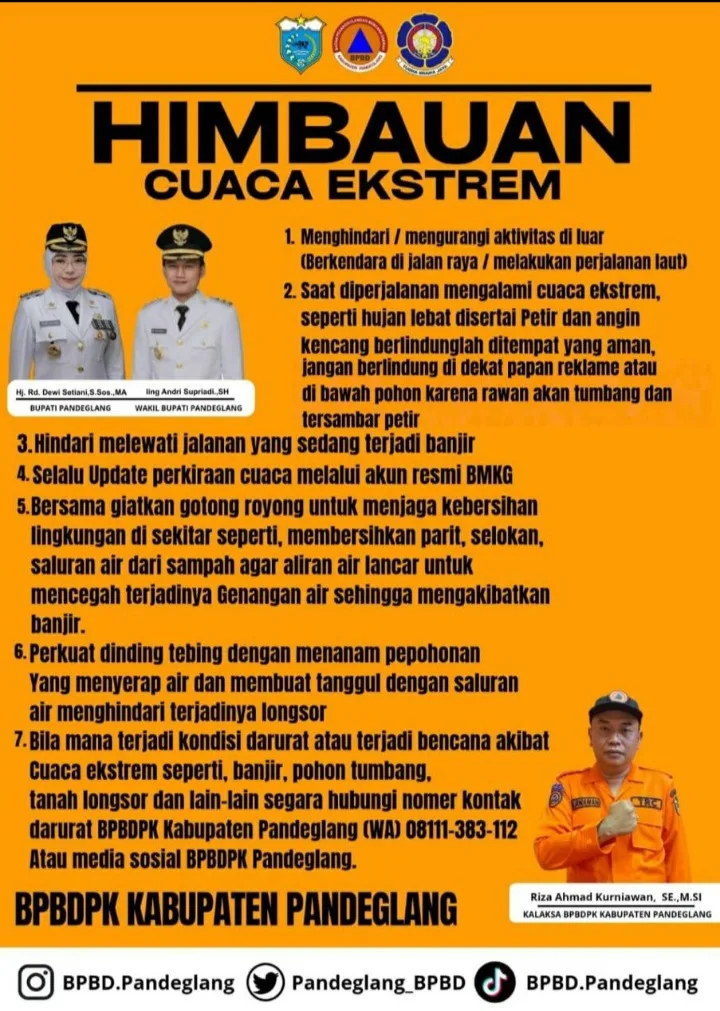 BANTEN72 — Bupati Pandeglang, Raden Dewi Setiani, melalui Badan Penanggulangan Bencana Daerah dan Pemadam Kebakaran (BPBDPK), mengeluarkan imbauan kepada masyarakat agar meningkatkan kewaspadaan terhadap potensi cuaca ekstrem yang diperkirakan masih akan terjadi hingga akhir tahun 2025.